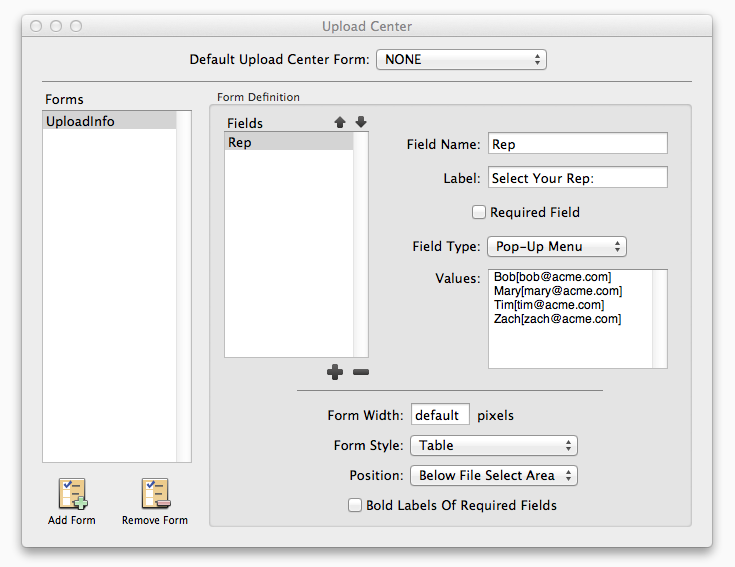 By way of example, let's assume that you have 4 sales representatives in your organization: Bob, Mary, Tim and Zach. You've set up the drop box to make it easy for clients to upload files, but need to allow those clients to specify who their sales rep is, and then have that rep receive an e-mail when new files are uploaded via the drop box.