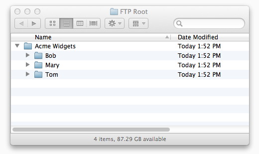 Finally, the Home Folders of the users to be notified in this example all share a common parent folder. For example, let's assume that there is a folder in our FTP Root folder called "Acme Widgets", and there are 3 folders within that: "Bob", "Mary" and "Tom". The users "Bob", "Mary" and "Tom", who all work for the company "Acme Widgets", have their account Home Folders defined accordingly.