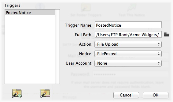 Next, on the Event Notices window, click "Set Folder Triggers" to open the Folder Triggers sheet. Click the "New Trigger" button to create a new Folder Trigger, and set up the trigger so that the "FilePosted" notice is executed when a file is uploaded to the parent folder which contains the Home Folders for those user accounts who need to be notified.